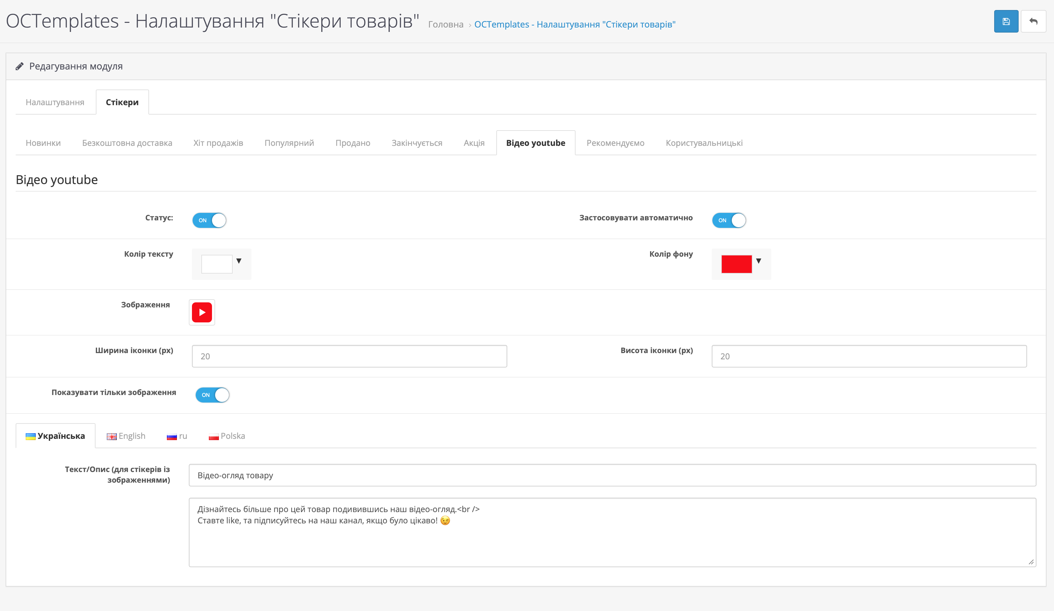 - "Застосовувати автоматично" дозволяє автоматично додавати стікер до товарів, у яких прикріплено YouTube відео;