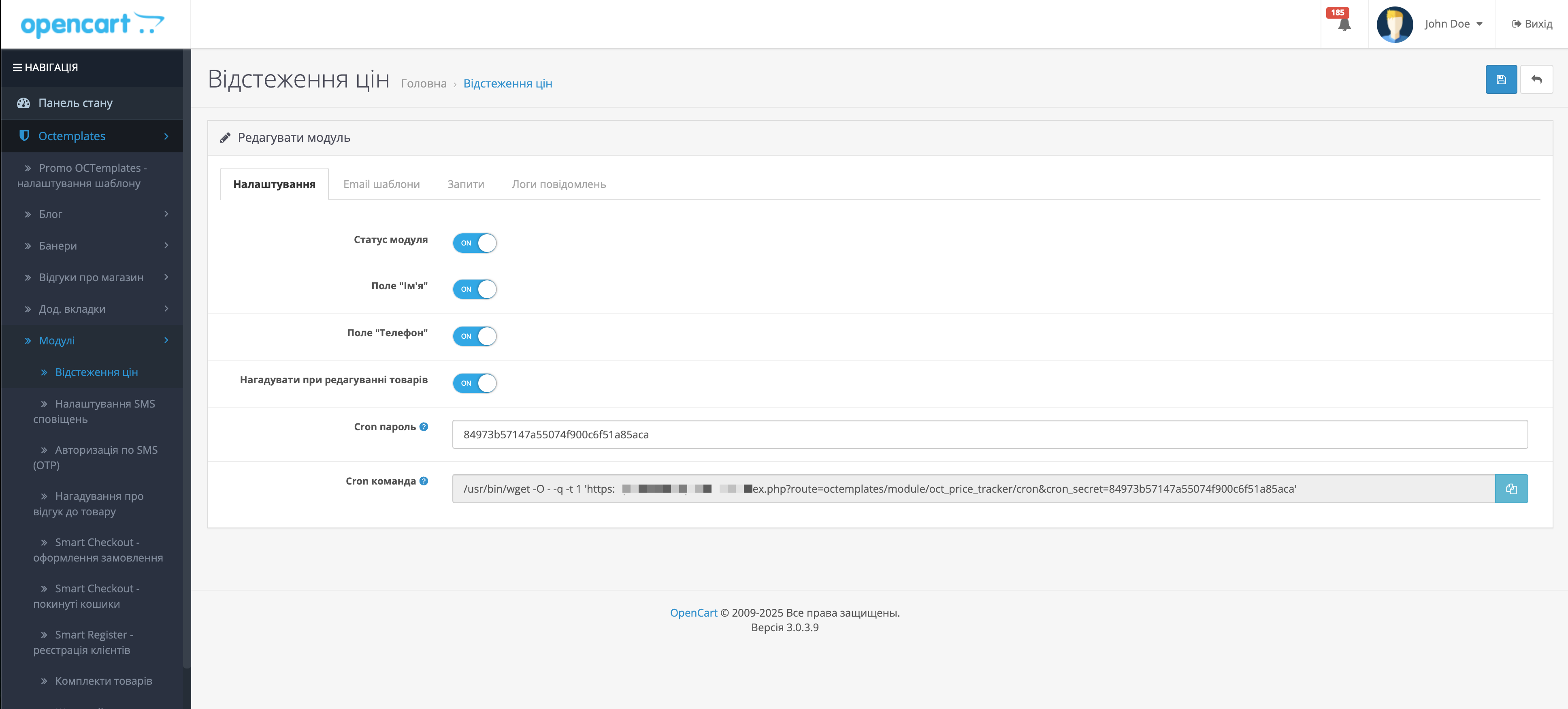 - Статус модуля – активує або деактивує функцію відстеження цін на сайті;