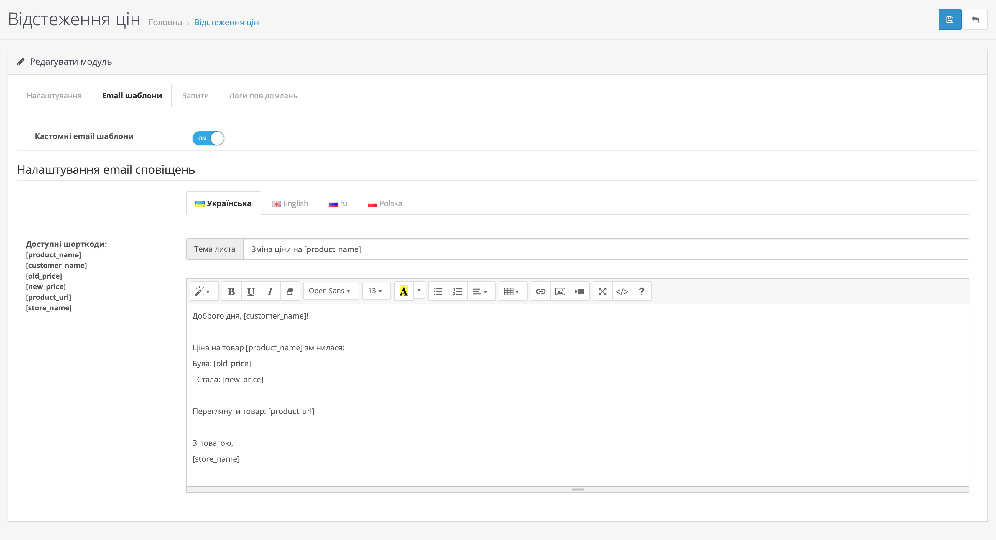 - Налаштування email співповідомлення – дозволяє редагувати текст, тему та вміст email повідомлення, яке буде відправлено клієнту при зміні ціни товару;