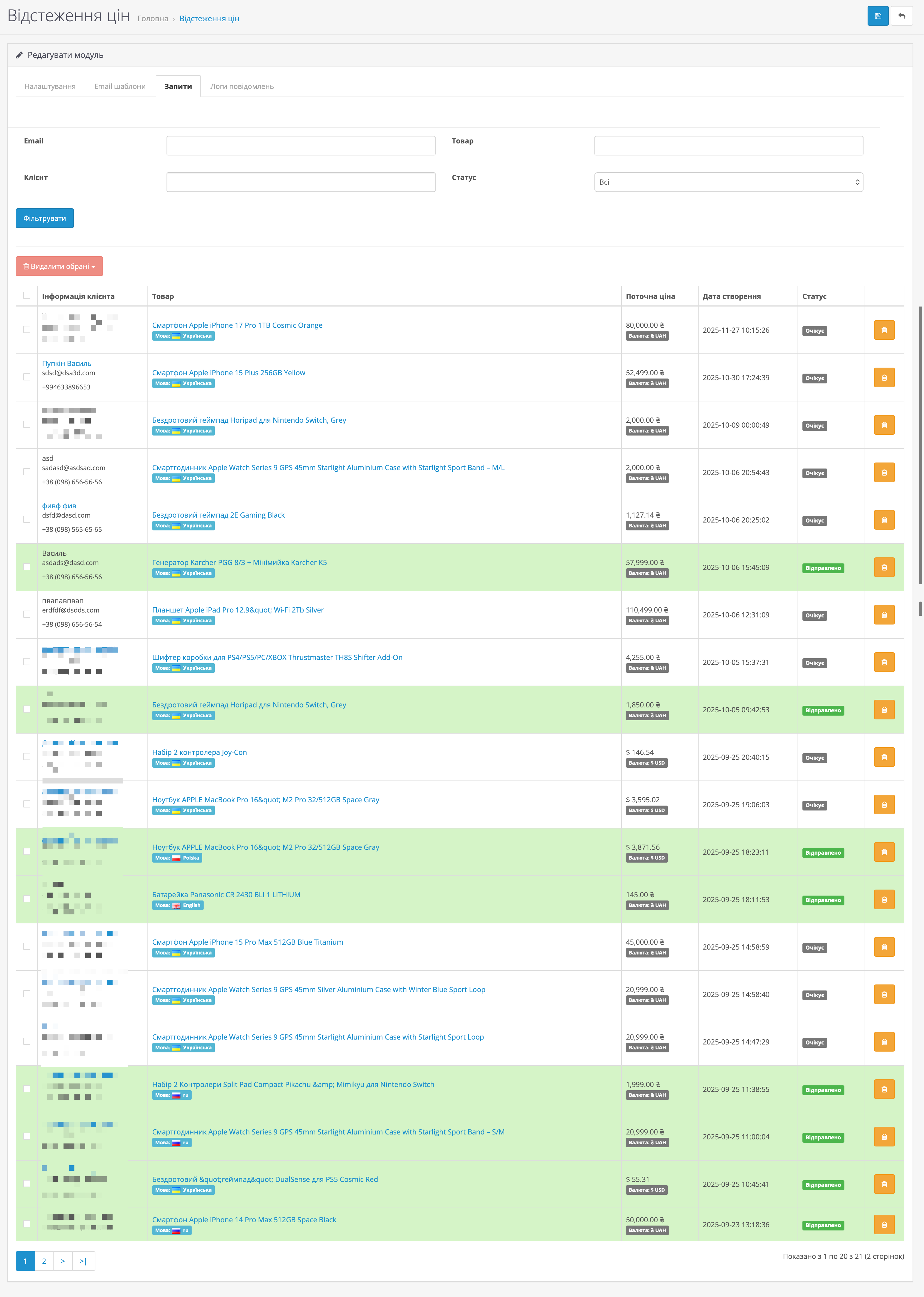 Ця вкладка показує усі активні запити від клієнтів на відстеження цін товарів з такою інформацією: