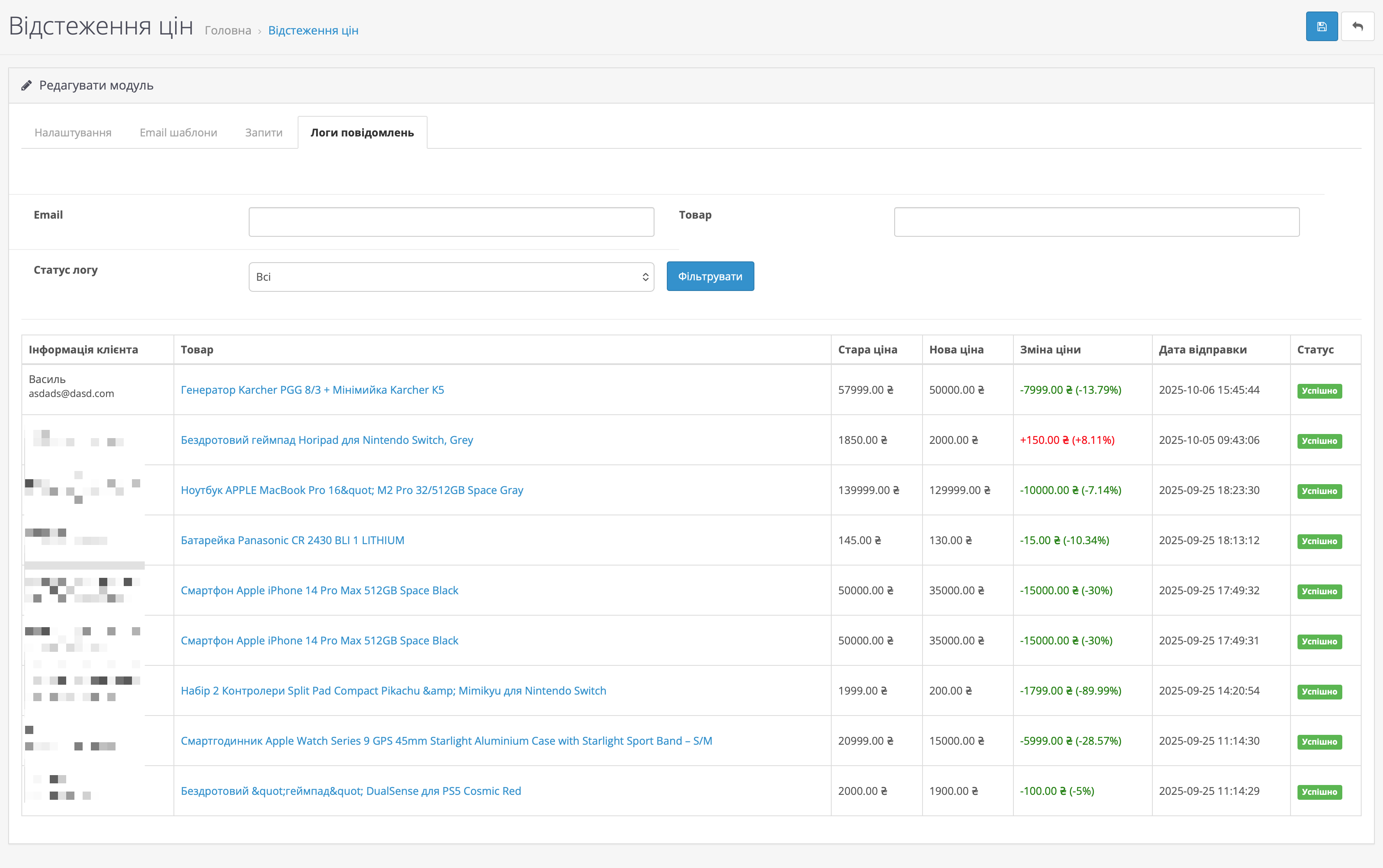 Цея вкладка відображає детальний журнал усіх відправлених email повідомлень про зміни цін: